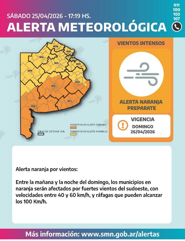 El Servicio Meteorológico Nacional emitió un alerta por fuertes vientos para este domingo en toda la provincia de Buenos Aires. En la mitad norte del territorio bonaerense la advertencia es de nivel amarillo y en la sur, naranja.