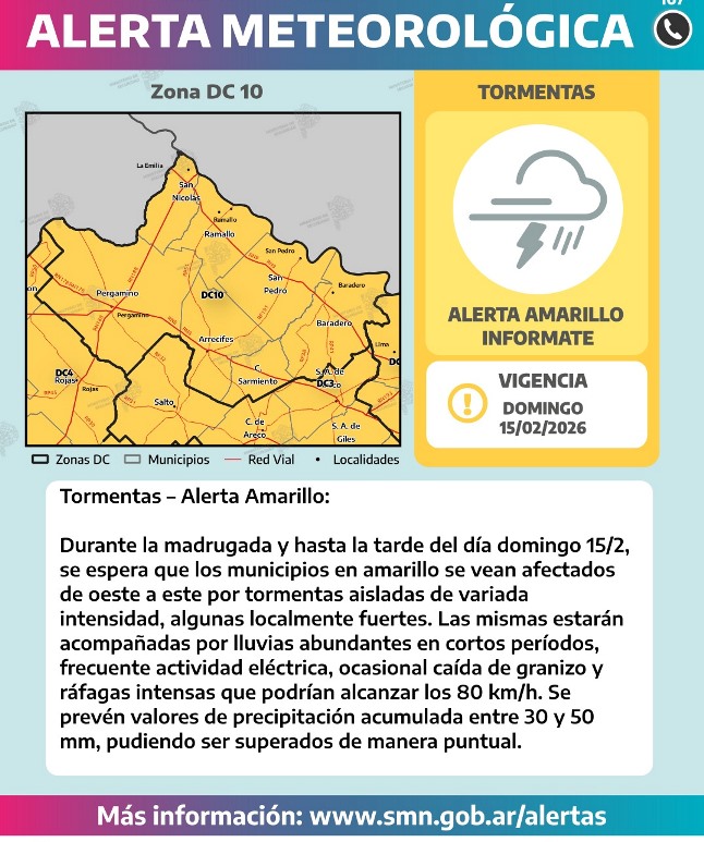 Defensa Civil Arrecifes informó el alerta amarillo emitido por el Servicio Meteorológico Nacional anticipando tormentas de variada intensidad, algunas localmente fuertes, para este domingo.