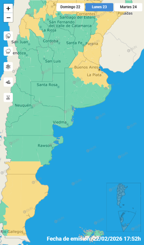 La advertencia es de nivel amarillo por tormentas aisladas con intensas lluvias en cortos períodos de tiempo y se extiende al sur de la provincia de Santa Fe y a toda Entre Ríos, entre otros lugares del país.