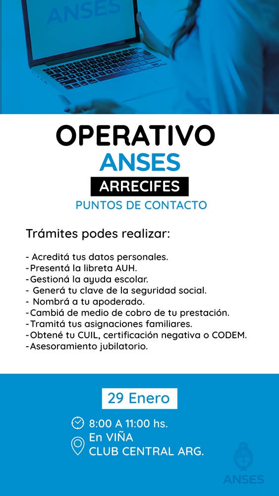 La agencia Arrecifes de ANSES, a cargo de Elizabeth Domingo, informa que la próxima semana estará llevando la atención habitual de su sede de Avenida Merlassino a Todd, Viña y el barrio La Cumbre.