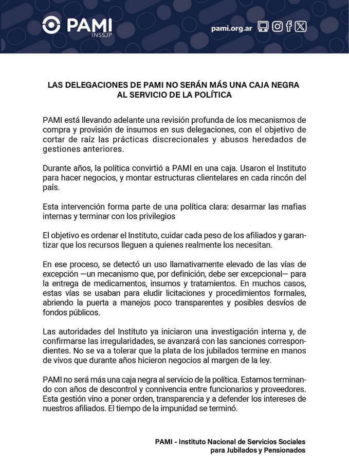 Por último, en el comunicado se asegura que “PAMI no será más una caja negra al servicio de la política. Estamos terminando con años de descontrol y connivencia entre funcionarios y proveedores. Esta gestión vino a poner orden, transparencia y a defender los intereses de nuestros afiliados. El tiempo de la impunidad se terminó”.