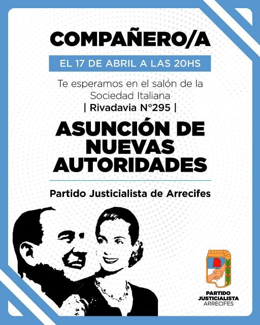 Hoy viernes, desde las 20:00, en el salón de la Sociedad Italiana, en calle Rivadavia 295, se realizará el acto oficial de asunción y presentación de las nuevas autoridades del Partido Justicialista de Arrecifes, tras la renovación realizada en febrero este año.