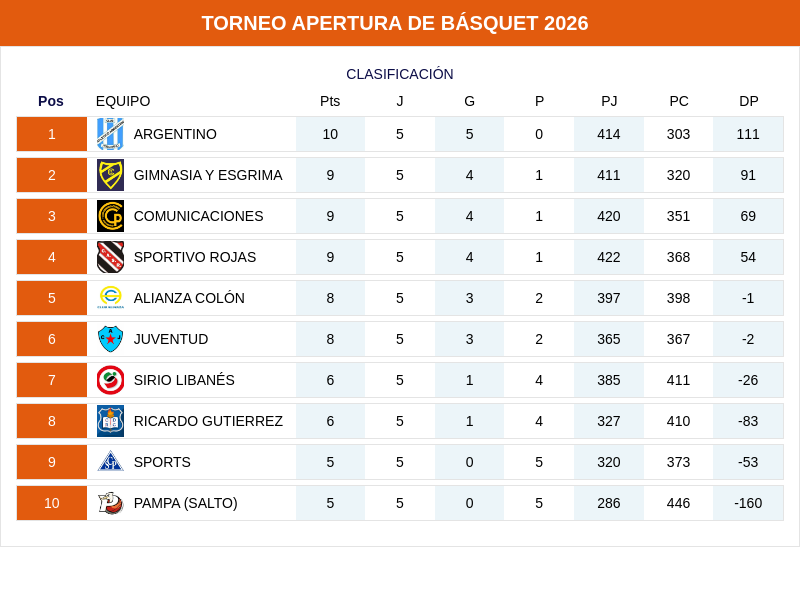 Este miércoles se completó la quinta fecha del Apertura de primera división de la Asociación Pergaminense de Básquet, que había arrancado el martes con el imparable Argentino venciendo como visitante a Sirio Libanés 66-72.