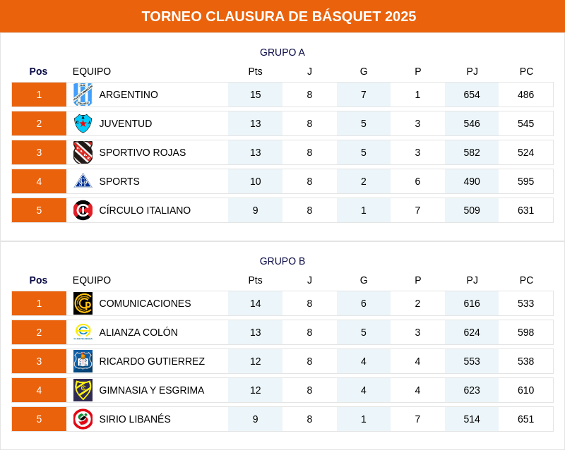 Anoche finalizó la fase de gurpos del Clausura 2025 de primera división que organiza la Asociación Pergaminense de Básquet. En el cierre de la Zona A, Sportivo Rojas le ganó en Colón a Círculo Italiano por 67-93 y Sports hizo lo propio en su cancha sobre Juventud, por un apretado 70-69.