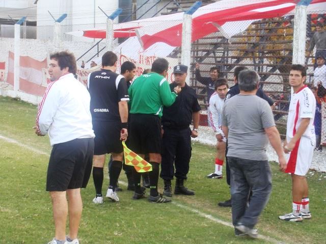 Luego, hinchas de Huracán arrojaron proyectiles sobre los suplentes de Brown que estaban calentando, hiriendo en la cabeza a un futbolista verdinegro. Allí se paró el partido y se generó una pelea entre los jugadores que estuvo “ahí” de terminar a las piñas. Enseguida, un pesado palo de un bombo arrojado desde la misma tribuna del Globo cayó con violencia en la zona de plateas. De milagro no le pegó a nadie (había niños en ese sector). Le podía haber roto la cabeza a cualquiera.