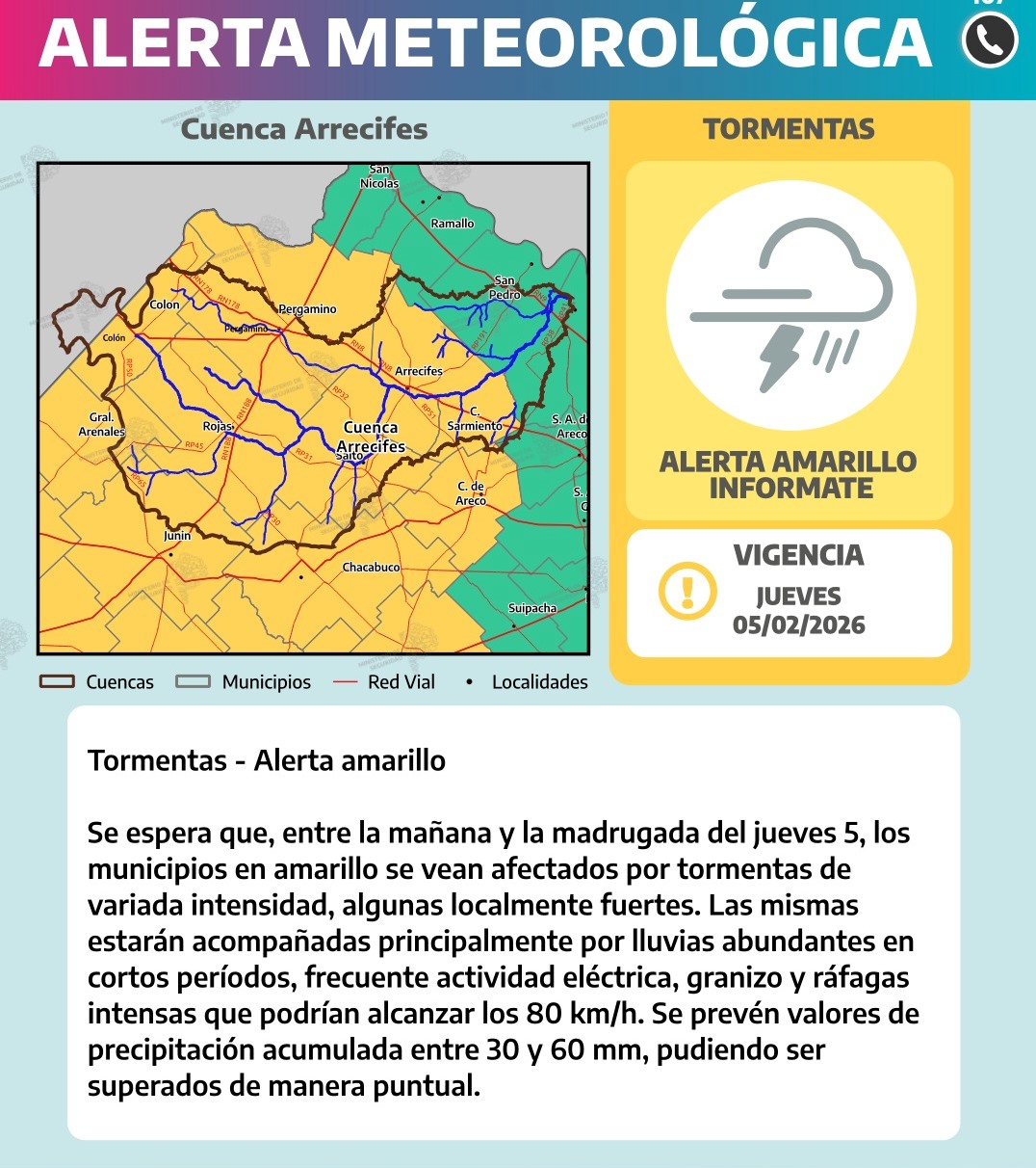 En la noche de este miércoles, el Servicio Meteorológico Nacional modificó los horarios sobre el alerta meteorológico emitido para el jueves 5 de febrero en Arrecifes y la región noroeste y centro de la provincia de Buenos Aires.