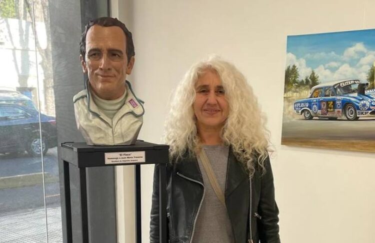 La obra en homenaje al histórico Flaco, ya leyenda imborrable del automovilismo argentino, acompaña una muestra de Fuel-Art, grupo de pintores, dibujantes y escultores dedicados al deporte motor, que se desarrolla en la misma sede de la AAV.