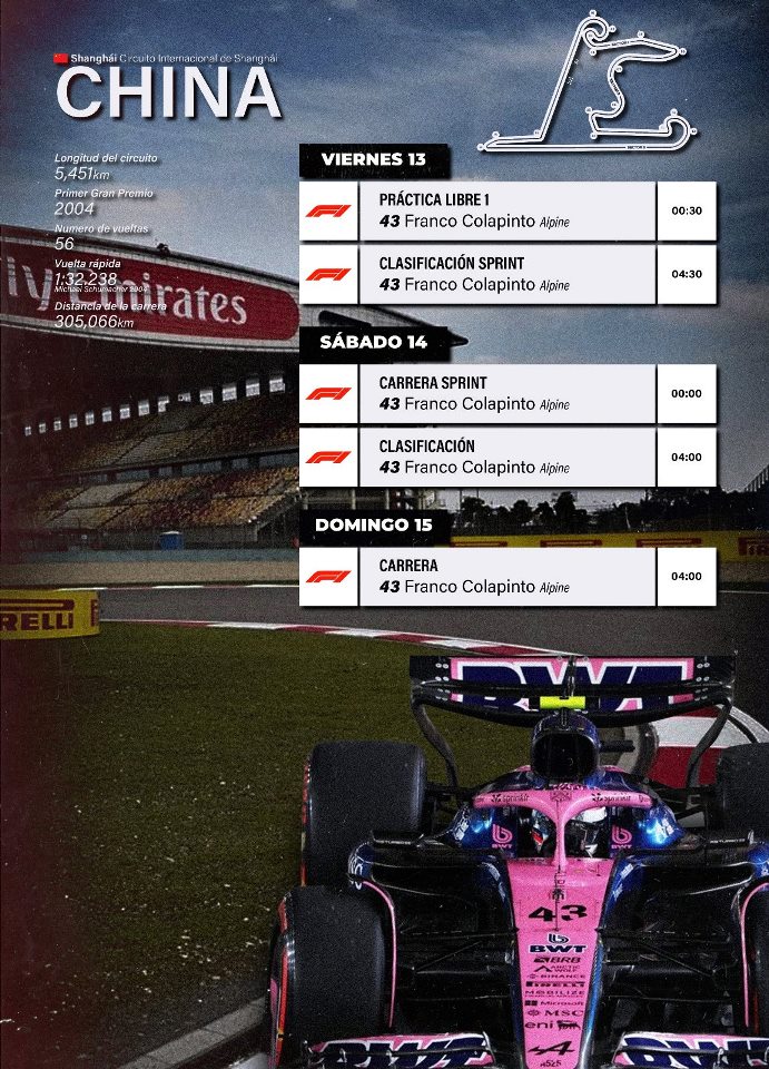 Después del comienzo en el Gran Premio de Australia, donde Alpine no se mostró competitivo y Franco Colapinto fue sancionado por un error de uno de sus mecánicos, el argentino corre su 28º GP en Fórmula 1. No se espera una gran evolución del equipo francés, puesto que desde Australia viajaron el lunes hacia China sin tiempo para demasiados cambios.