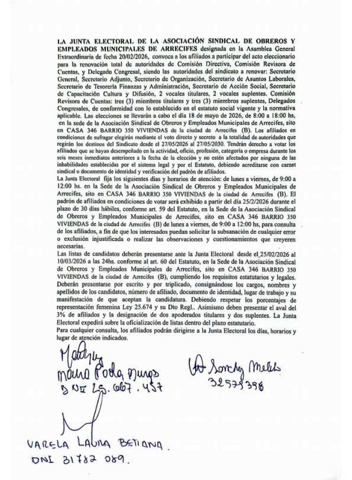 LA JUNTA ELECTORAL DE LA ASOCIACIÓN SINDICAL DE OBREROS Y EMPLEADOS MUNICIPALES DE ARRECIFES designada en la Asamblea General Extraordinaria de fecha 20/02/2026, convoca a los afiliados a participar del acto eleccionario para la renovación total de autoridades de Comisión Directiva, Comisión Revisora de Cuentas, y Delegado Congresal, siendo las autoridades del sindicato a renovar: Secretario Gencral, Secretario Adjunto, Secretario de Organización, Secretario de Asuntos Laborales, Secretario de Tesorería Finanzas y Administración, Sccretario de Acción Socíal, Secretario de Capacitación Cultura y Difusión, 2 vocales titulares, 2 vocales suplentes. Comisión Revisora de Cuentas: tres (3) miembros titulares y tres (3) miembros suplentes, Delegados Congresales, de conformidad con lo establecido en el estatuto social vigente y la normativa aplicable. Las elecciones se llevarán a cabo el día 18 de mayo de 2026, de 8:00 a 18:00 hs, en la sede de la Asociación Sindical de Obreros y Empleados Municipales de Arrecifes, sito en CASA 346 BARRIO 350 VIVIENDAS de la ciudad de Arrecifes (B). Los afiliados en condiciones de sufragar clegirán mediante el voto directo y secreto a la totalidad de autoridades que