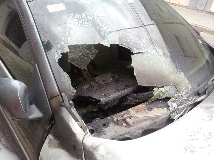 Al auto le hicieron explotar la luneta con un enorme baldosón y luego lo prendieron fuego en la parte del motor. El vehículo no sirve más.