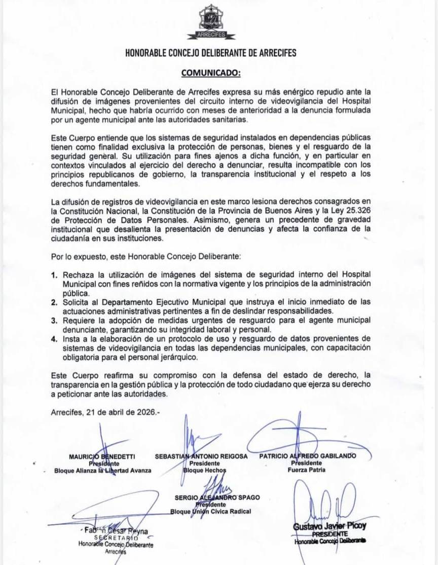El Honorable Concejo Deliberante de Arrecifes expresa su más enérgico repudio ante la difusión de imágenes provenientes del circuito interno de videovigilancia del Hospital Municipal, hecho que habría ocurrido con meses de anterioridad a la denuncia formulada por un agente municipal ante las autoridades sanitarias.
