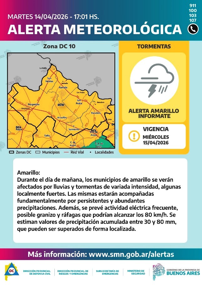 La Dirección de Defensa Civil de Arrecifes difundió un alerta emitido por el Servicio Meteorológico Nacional por tormentas y lluvias de variada intensidad para la región noroeste de la provincia de Buenos Aires. Las mismas se iniciaría en la madrugada de este miércoles, prolongándose con breves interrupciones hasta las primeras horas de la madrugada del jueves.