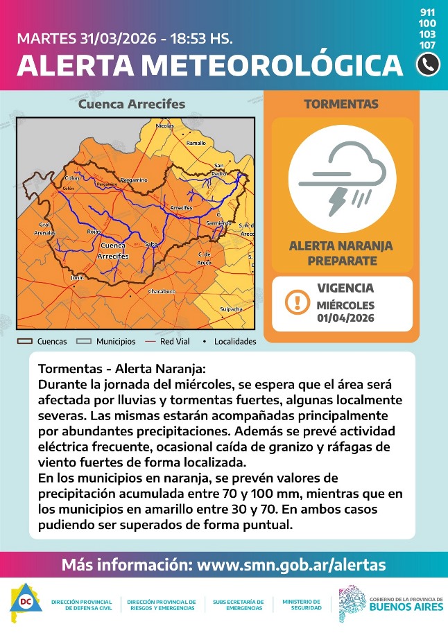 La Dirección de Defensa Civil de Arrecifes informó que el alerta por fuertes tormentas emitido por el Servicio Meteorológico Nacional, pasó de amarillo a naranja para este miérc8oles 1 de abril en nuestra región.