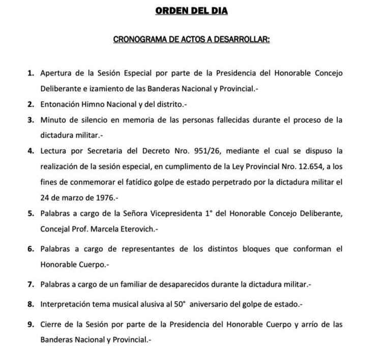 Harán uso de la palabra la vicepresidenta 1ª y los presidentes de los cinco bloques políticos que integran el departamento deliberativo arrecifeño. También hablará un familiar de desaparecidos durante la última dictadura militar.