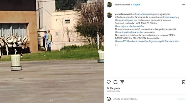 “La @escuelanueva6 quiere agradecer infinitamente a los familiares de las auxiliares @normarearte y @Laurarodriguez por cortarnos el pasto de la escuela. Hicimos la solicitud HACE MAS DE 20 DÍAS al @consejoescolardearrecifes, que nos respondió que realizaría las gestiones ante la @municipalidaddearrecifes pero NADA. Nos sentimos totalmente descuidados por quienes DICEN IMPORTARLES la EDUCACIÓN. Lamentable”.