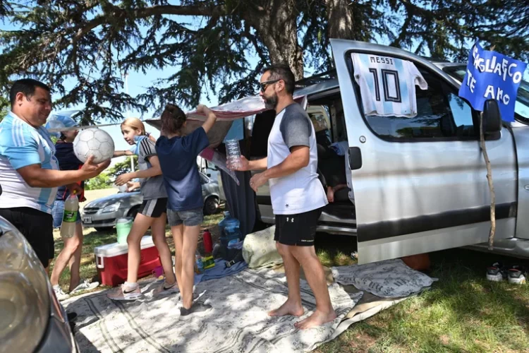 El acampe arrancó desde las primeras horas de esta mañana. Con reposeras, heladeras, banderas y camisetas de la Selección, familias y grupos de amigos se instalaron en la puerta principal de acceso al predio para esperar a los jugadores. Llegó gente de distintas provincias, hasta de Tucumán y Misiones.