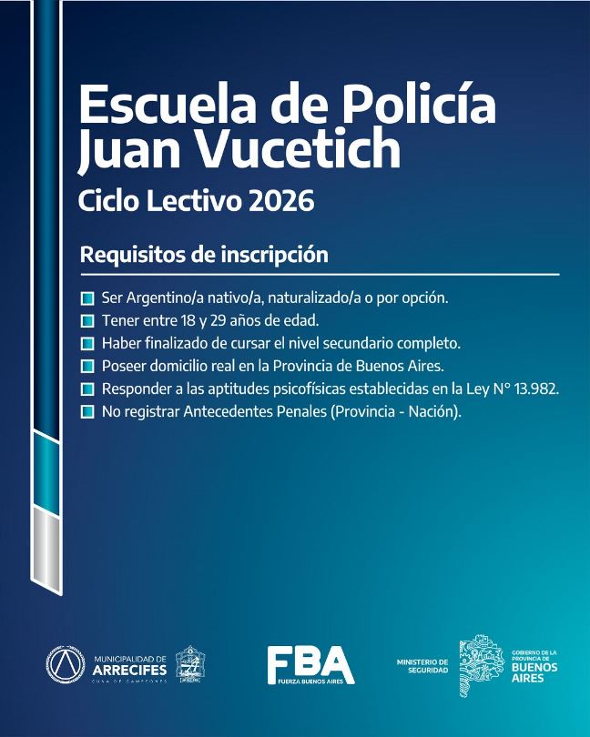 La Secretaría de Seguridad de la Municipalidad de Arrecifes informa que se encuentra abierta la inscripción para quienes deseen ingresar a la Escuela de Policía “Juan Vucetich”. Esta es una oportunidad para formar parte de las fuerzas de seguridad y servir a la comunidad.