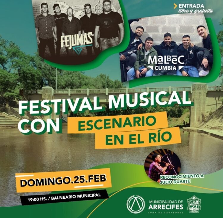 Este domingo 25, a partir de las 19:00, la Municipalidad de Arrecifes, a través de la Dirección de Cultura, ofrecerá un gran espectáculo musical en el Balneario Municipal, con un escenario montado sobre las aguas del río Arrecifes.