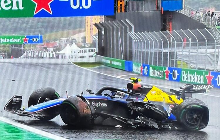 Con la lluvia arreciando, en la vuelta 30 la dirección de carrera optó por ingresar el auto de seguridad debido a las difíciles condiciones de pista. Colapinto volvió a boxes para montar otro set de neumáticos (vueltas antes había puesto uno nuevo), pero las complicaciones persistieron: en la recta principal, perdió el control de su Williams y terminó impactando contra el muro. El incidente no solo dejó fuera de carrera al pilarense, sino que también desencadenó la bandera roja.