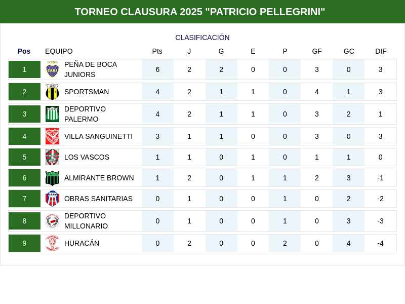Más tarde, la Peña de Boca Juniors derrotó 1-0 a Huracán, con gol de Daniel Buffa en el primer tiempo y quedó como único lider del certamen que lleva el nombre de Patricio Pellegrini.