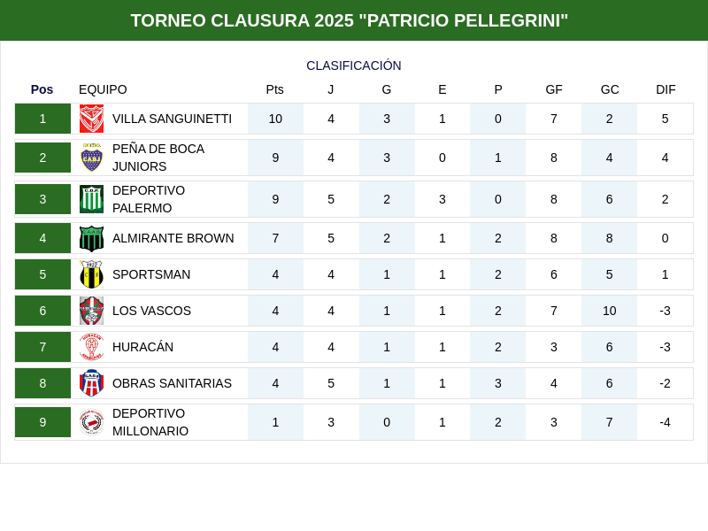 Con su ajustado triunfo sobre Obras Sanitarias por 1-0 y aprovechando el empate de Palermo contra Huracán, Villa Sanguinetti volvió después de mucho tiempo a liderar un torneo en soledad, cumplida la quinta fecha del Clausura “Patricio Pellegrini” del fútbol arrecifeño.