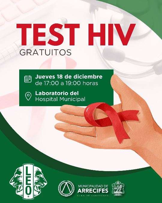 Este jueves 18 de diciembre, de 17:00 a 19:00, en el marco del mes de la prevención contra el HIV, la Secretaría de Salud de la Municipalidad de Arrecifes, junto a los chicos del Club Leo, llevarán adelante una jornada especial de test de HIV gratuitos y confidenciales en el laboratorio del Hospital Municipal.