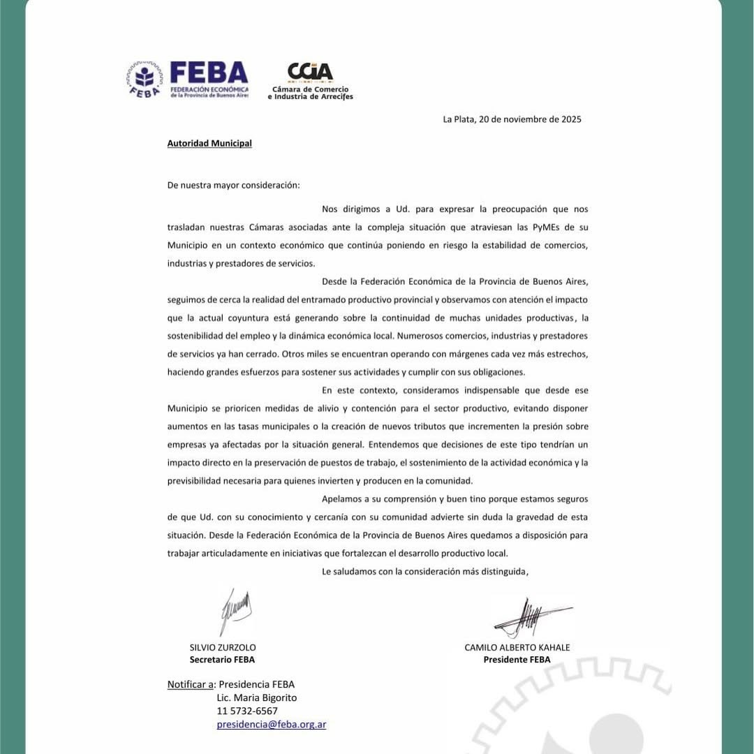En una nota dirigida a las autoridades municipales, acompañada por la Cámara de Comercio e Industria de Arrecifes, la FEBA se manifiesta con la firma de su presidente, Camilo Alberto Cahale, llamando a la reflexión al Intendente.
