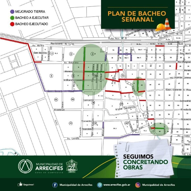 La Secretaría de Obras Públicas de la Municipalidad de Arrecifes continúa con el plan de bacheo de hormigón y asfalto en frío, que abarca distintos barrios y el centro de la ciudad. El objetivo es mejorar la calidad de las calles y avenidas, atendiendo a las necesidades de los vecinos y garantizando una infraestructura segura y en buen estado.