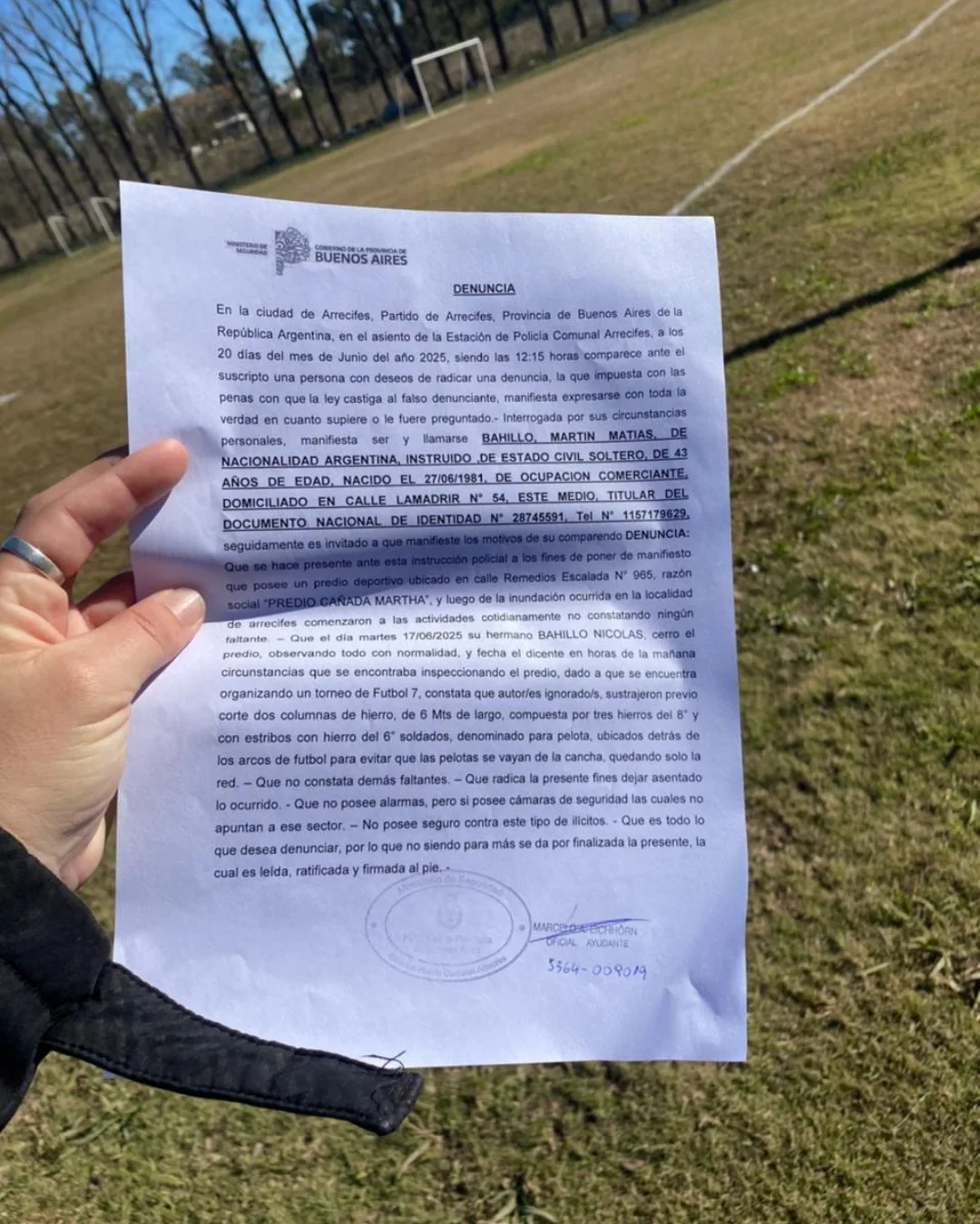 Van 16 veces que nos roban en este predio. No estamos hablando de un objeto pequeño que se pueden llevar en un bolso, hablamos de dos postes de seis metros que necesitan dos personas para moverlos, que tuvieron que cortarlos y sacarlos de manera organizada. ¿Cómo es posible que nadie se diera cuenta?