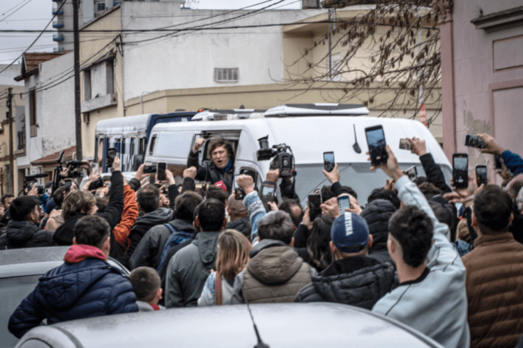 Milei llegó a la vecina ciudad para una recorrida por calle San Martín, frente al local de su precandidato a intendente, Ramón Salazar. Por la cantidad de gente que se agrupó, demoró unos 40 minutos para transitar menos de 50 metros.