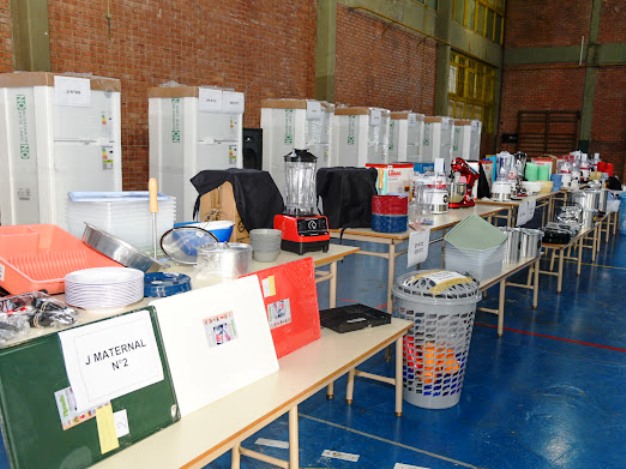 El cargamento de electrodomésticos varios y utensilios completos llegó el sábado al gimnasio de la Escuela de Educación Técnica Nº 1, donde funciona el CEF, y está siendo distribuido a todos los establecimientos educativos beneficiados.