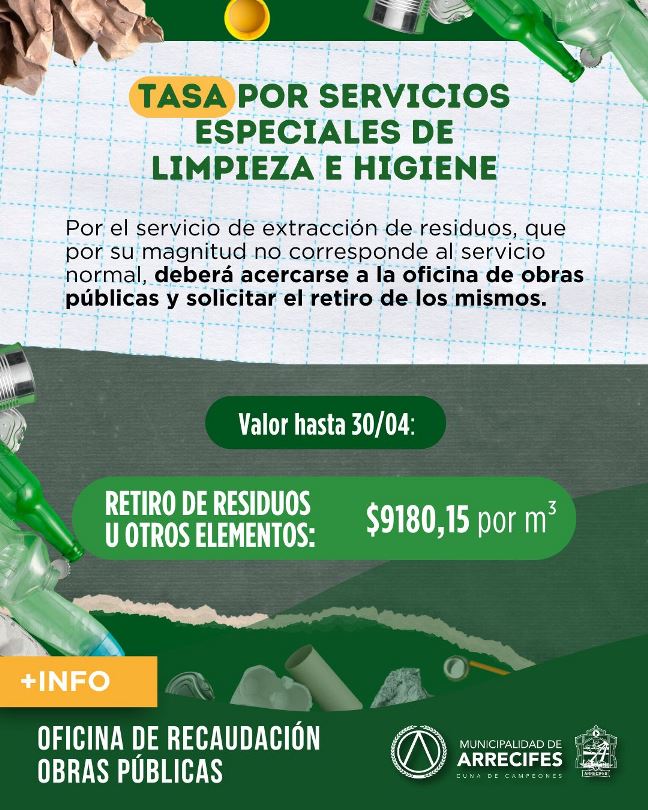La Municipalidad de Arrecifes informó hoy que se encuentra vigente la Tasa por Servicios Especiales de Limpieza e Higiene. La misma refiere al servicio de extracción de residuos, que por su magnitud, no corresponde al servicio normal.