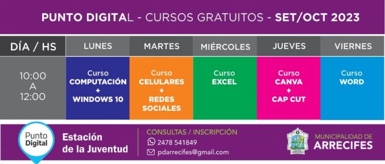 La Municipalidad de Arrecifes informa que se encuentran abiertas las inscripciones para los nuevos cursos gratuitos que se dictarán a partir del lunes 4 de septiembre en el Punto Digital (Estación de la Juventud).