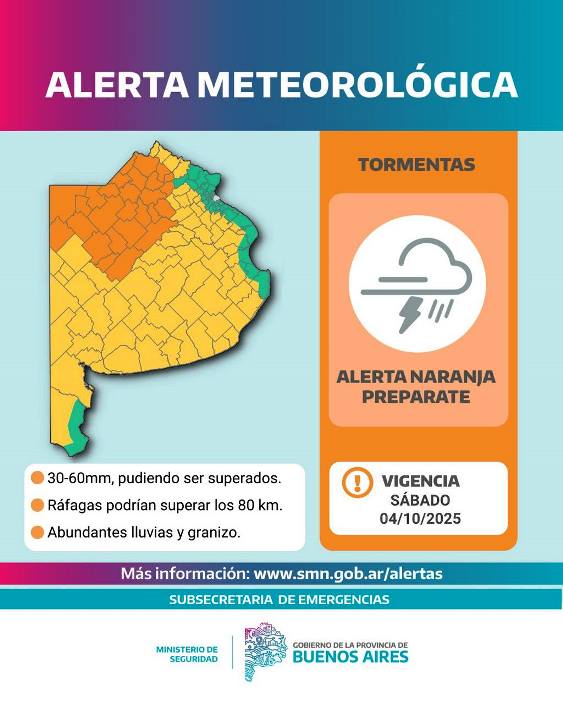 El principal fenómeno que se aguarda son las lluvias con abundante caída de agua en cortos períodos y tormentas, algunas acompañadas de ráfagas fuertes de viento que podrían superar los 80 km/h, intensa actividad eléctrica y ocasional caída de granizo.