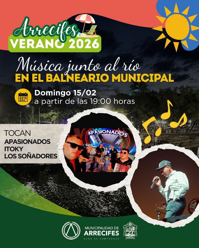 El gran éxito del verano vuelve a encender el Balneario Municipal de Arrecifes con otro fin de semana a pura música y alegría. Este domingo, en el escenario ubicado sobre la margen derecha del río, disfrutaremos de una tarde-noche inolvidable con música en vivo.
