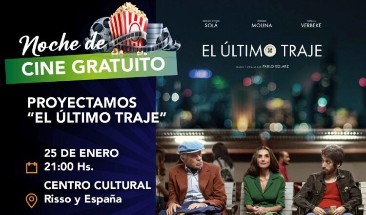 Este jueves 25 continúa el Ciclo de Cine en Verano en el Centro Cultural, libre y gratuito, organizado por la Dirección de Cultura de la Municipalidad de Arrecifes. A partir de las 21:00 se proyectará el film nacional ¨El último traje¨, con la dirección de Pablo Solarz y la actuación de Miguel Ángel Solá, Ángela Molina, Martín Piroyansky, Julia Beerhold y Olga Boladz.