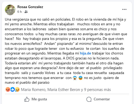 “Una vergüenza que no salió en policiales el robo en la vivienda de mi hija y mi yerno, anoche, mientras ellos trabajaban. Hay muchos robos en Arrecifes y no encuentran a los ladrones, saben bien quiénes son… Hay muchas caras raras, ¿no averiguan de qué viven, que hacen? No hay trabajo para los propios y ¿de qué viven los nuevos arrecifeños? Andan pispeando y al mínimo descuido te entran robar lo poco que lograste tener con tu esfuerzo; te cortan los sueños de progresar en un segundo”, se descargó la mujer. Y agregó: