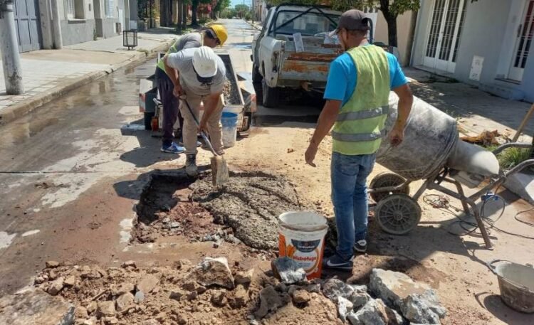 Personal del área de Obras Sanitarias de la Municipalidad de Arrecifes trabaja en distintos sectores de la ciudad, llevando a cabo tareas que consisten en bacheos y construcción de cámaras de cloacas, además de reparación de caños maestros.