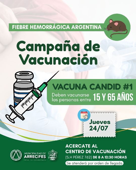 En la jornada del jueves se llevará a cabo una nueva jornada de vacunación contra la Fiebre Hemorrágica Argentina, una medida fundamental para prevenir y combatir esta enfermedad. El operativo de vacunación se realiza en el vacunatorio municipal (Santiago H. Pérez 762), en el horario de 07:30 a 12:30.