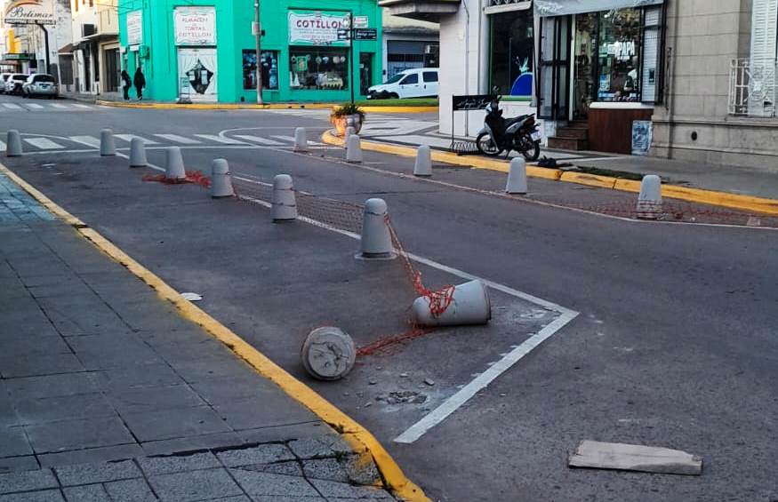Pero los bolardos no sólo se derriban ante los impactos. También se descubrió que se caen antge el mínimo contacto, ya que se descubrió que no fueron colocados como corresponde, con las varillas de hierro que traen incrustadas en el piso. Sólo se han pegado con cemento. Por ello es que a lo largo de toda la calle céntrica se observan pilotes tirados cuando la obra aún no ha sido inaugurada.