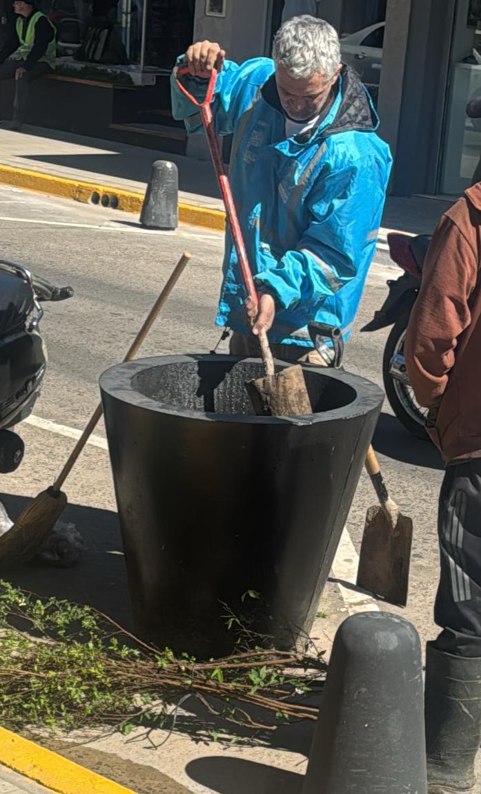 En el quinto mes de trabajos en el “embelleciiento” de calle Ricardo Gutiérrez, este martes se reanudó la colocación de tierra en los macetones ubicados en las esquinas de la arteria céntrica.