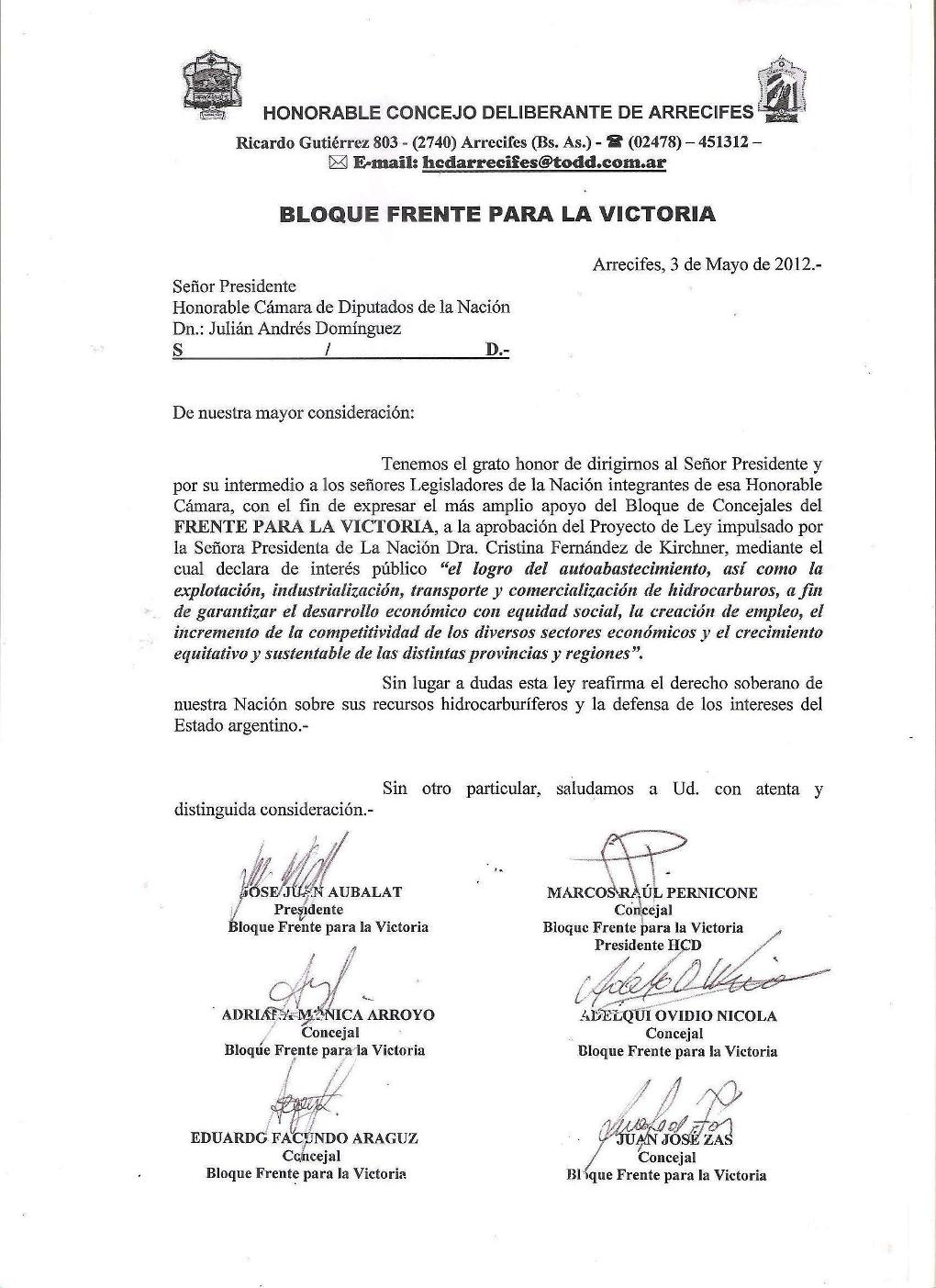 Ante la trascendente reestatización de YPF, refrendada anoche por amplia mayoría por la Cámara de Diputados de la Nación, el bloque de concejales del Frente para la Victoria de Arrecifes presentó una nota ante el presidente de la Legislatura, Julián Domínguez, manifestando su “más amplio apoyo” al proyecto de Ley impulsado para ello por la presidenta Cristina Fernández de Kirchner.