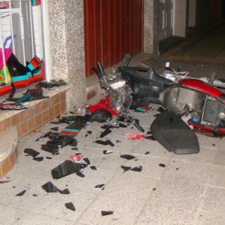 Una moto que circulaba a gran velocidad por Avenida Merlassino perdió el control y se incrustó en una de las vidrieras del comercio Práctico, ubicado en la intersección con calle Italia.