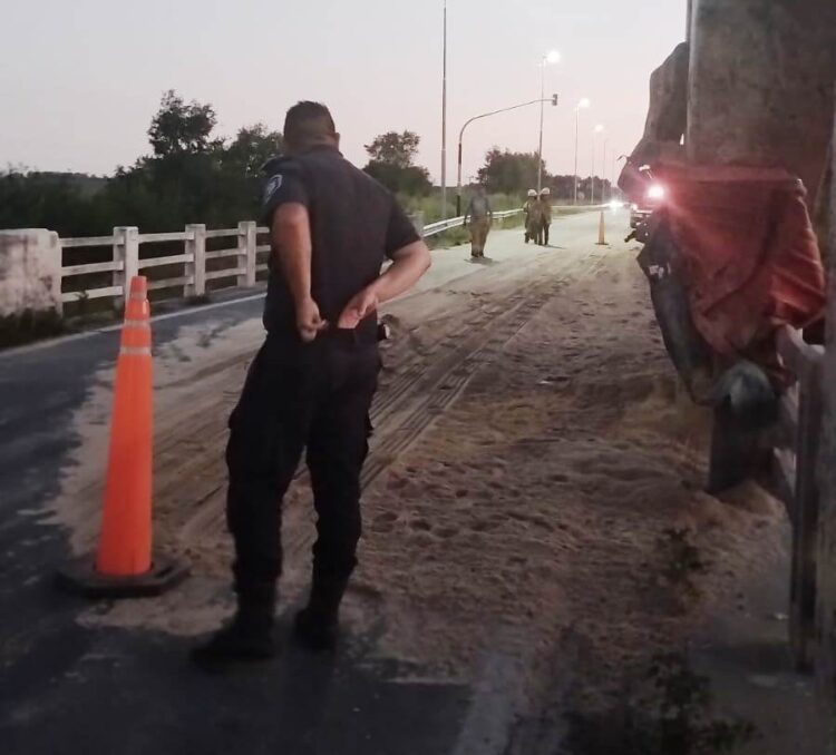 De inmediato, personal policial y de Tránsito municipal se hicieron presentes en el lugar para delimitar el tránsito, puesto el riesgo que significa la arena desparramada sobre el asfalto. Bomberos Voluntarios trabajan limpiando la ruta. Se ruega circular con precaución.