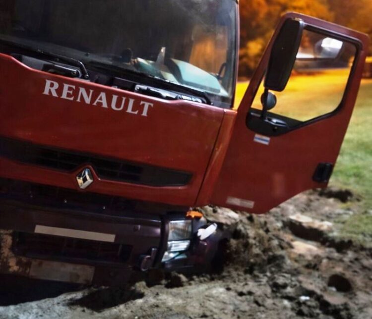 En la medianoche de este sábado, iniciándose el día domingo, un camión Renault que transitaba por la esquina de Avenida Lavalle y Alberdi, de pronto cayó en un enorme pozo abierto junto al cordón de la vereda y quedó atrapado.