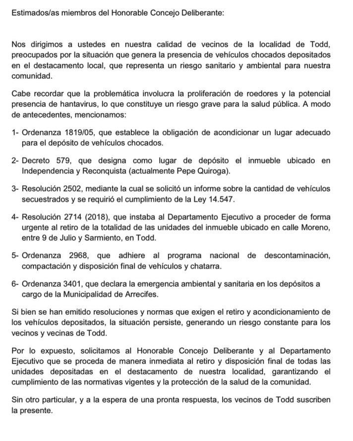 En tiempos, encima, de alto riesgo por el hantavirus, es el mismo Estado el que genera sitios y situaciones de riesgo de contagio. Por ello, la comunidad de Todd insiste una vez más y está juntando firmas para presentar una nueva nota en la Municipalidad de Arrecifes y en el Concejo Deliberante.