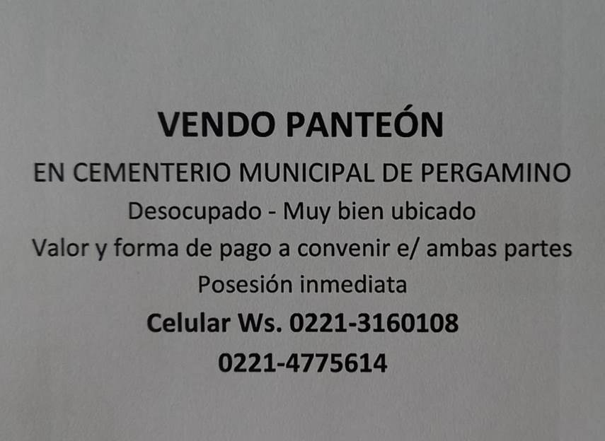 Vendo panteón en el Cementerio Municipal de Pergamino.